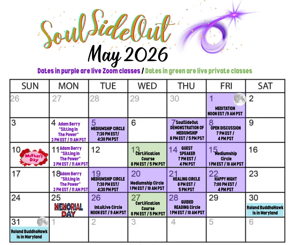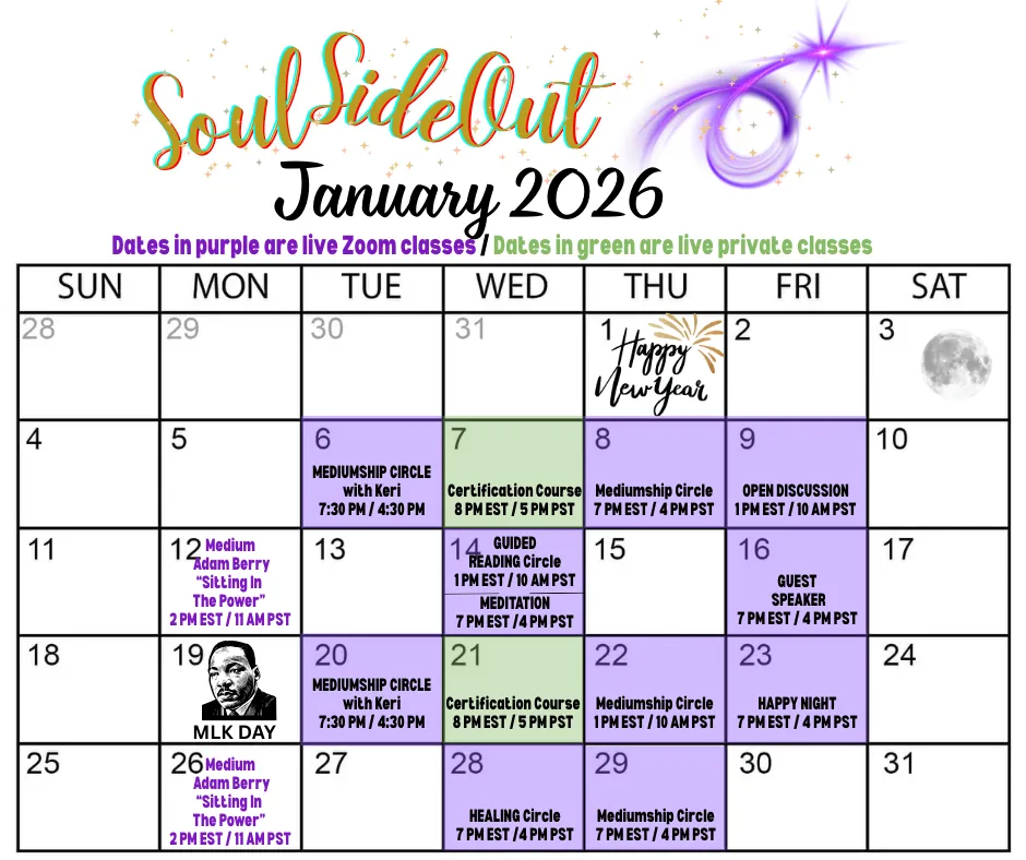Your path of spiritual development is unique, and SoulSideOut is here to meet you where you are. With a variety of circles, classes, and gatherings, you’ll find the unique guidance and encouragement you need -- whether you're just beginning to explore your intuitive abilities or seeking to deepen your connection with Spirit.