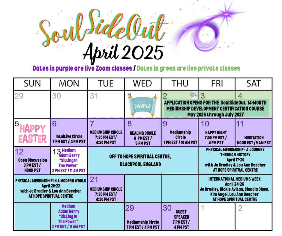 Lou Ann is a tutor for the International Spiritualist Federation and the annual International Mediums Week. She is the founder of the SoulSideOut Mediumship Membership Community—a supportive space where developing mediums can unfold their abilities, share experiences, and find encouragement along the way.