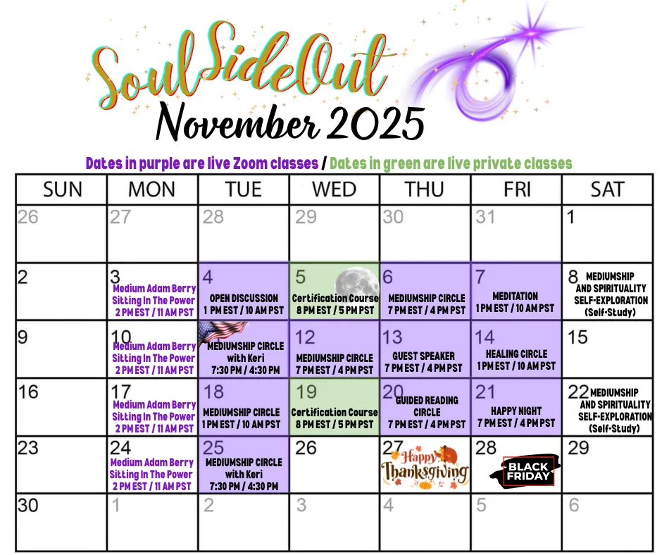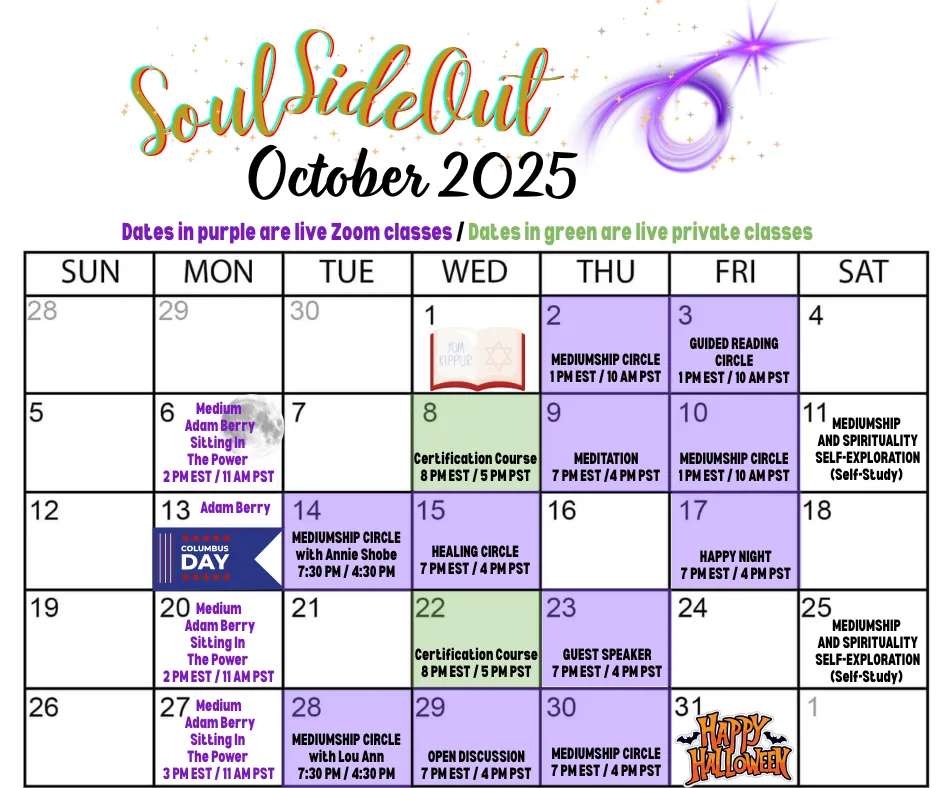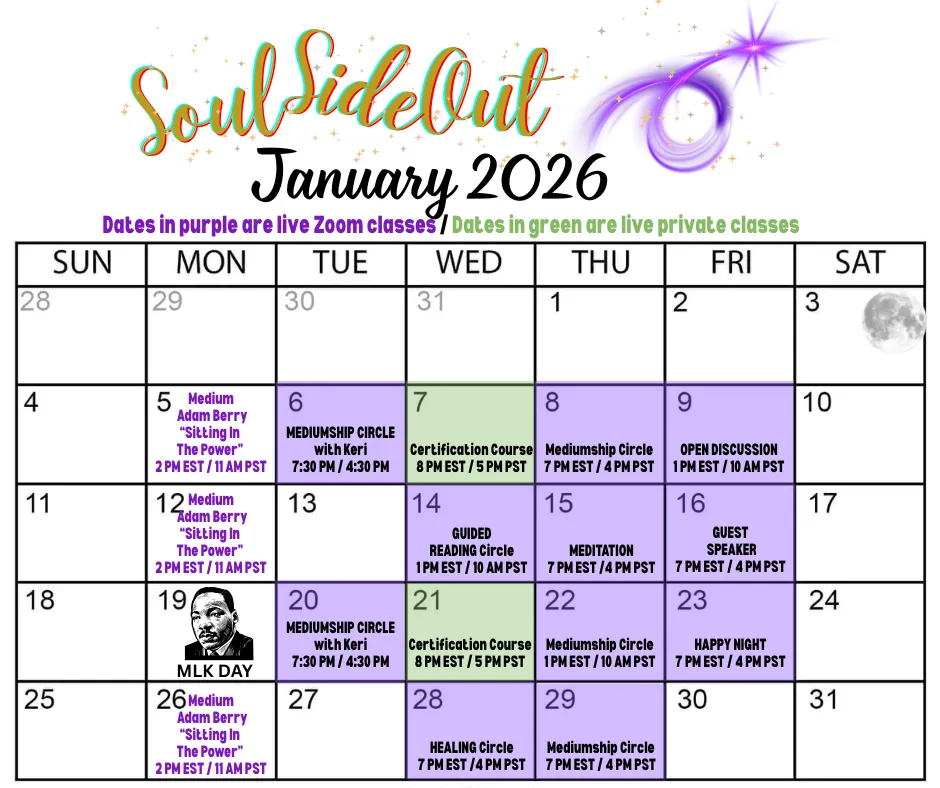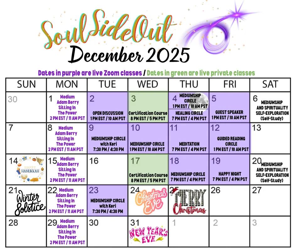 Your path of spiritual development is unique, and SoulSideOut is here to meet you where you are. With a variety of circles, classes, and gatherings, you’ll find the unique guidance and encouragement you need -- whether you're just beginning to explore your intuitive abilities or seeking to deepen your connection with Spirit.