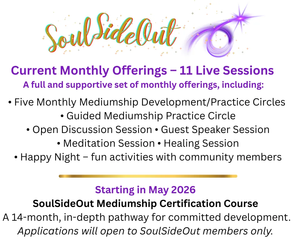 Working with SoulSideOut changed my life in many positive ways, Their understanding of spirit communication is extensive, and they share all they can to help you succeed. The support and guidance that they offer is unparalleled in any other online group that I have been a part of. Working with SoulSideOut for my mediumship development is the best choice that I ever made. If you are looking to begin your mediumship development, or go deeper with your learning and understanding of mediumship, choose SoulSideOut!