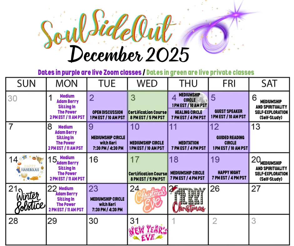 Your path of spiritual development is unique, and SoulSideOut is here to meet you where you are. With a variety of circles, classes, and gatherings, you’ll find the unique guidance and encouragement you need -- whether you're just beginning to explore your intuitive abilities or seeking to deepen your connection with Spirit.
